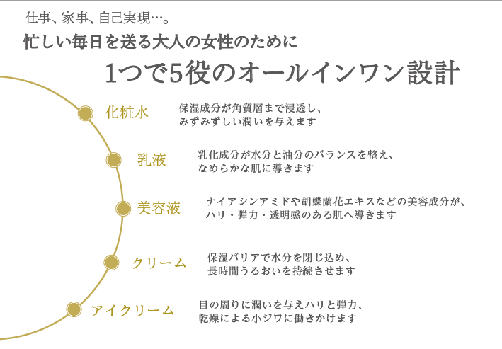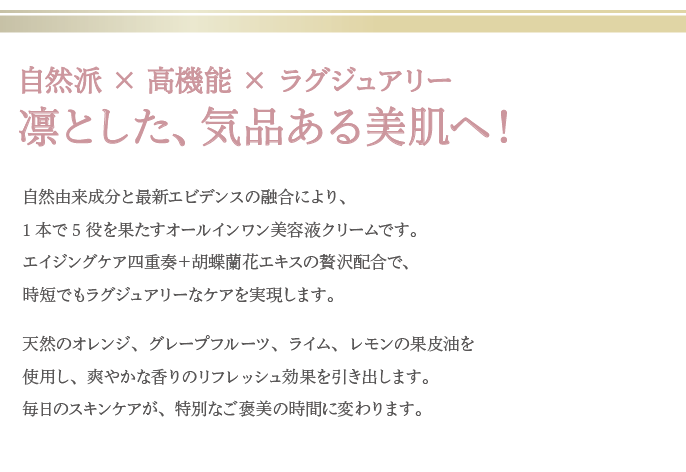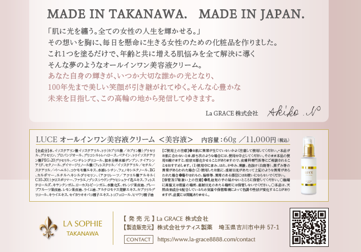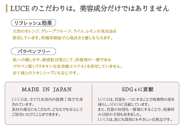 シンプルなステップで、肌本来の美しさを引き出すことを目指したオールインワンスキンケア「LUCE(ルーチェ)」。 忙しい日常の中でも無理なく続けられるケアで、年齢にとらわれない輝く素肌へ。美容家としての経験とこだわりを凝縮した、新しいスキンケアの提案です。